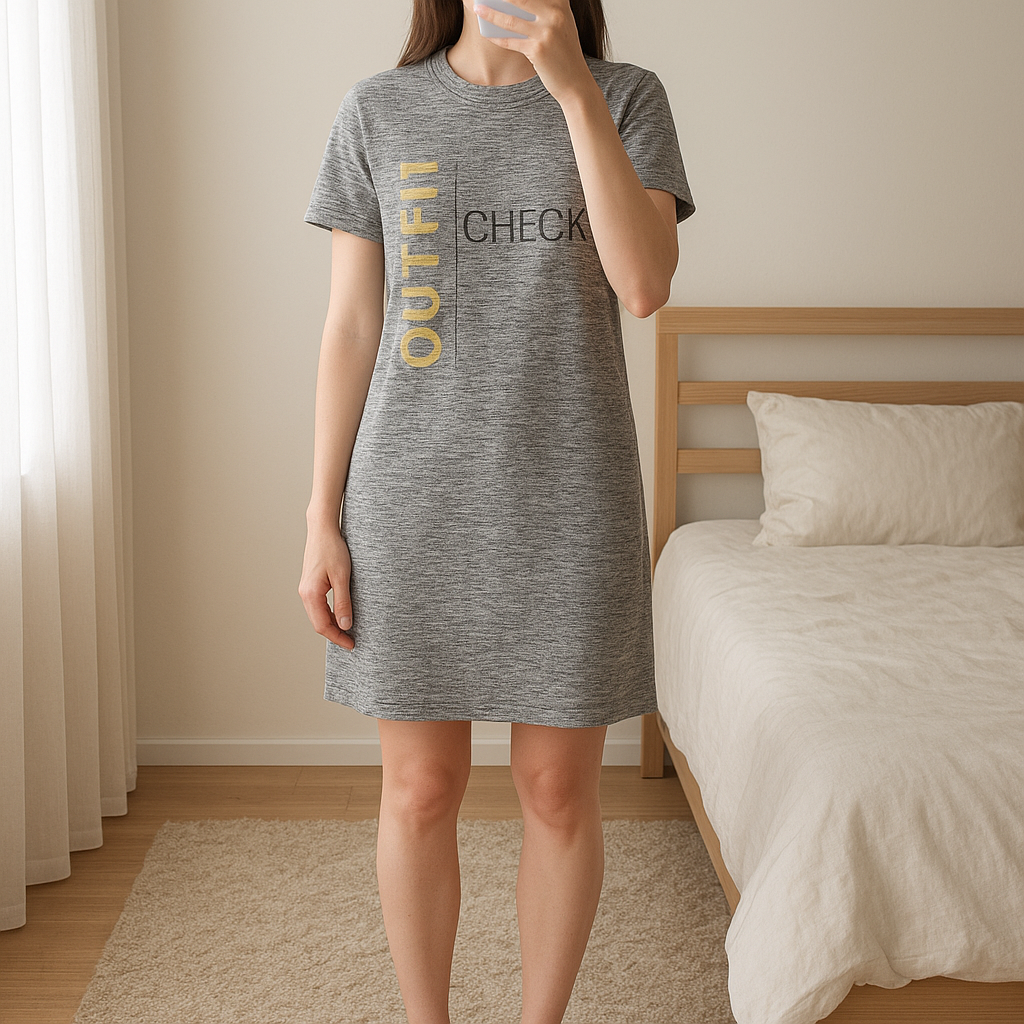 Szürke pólóruha standing straight facing the camera, in a softly lit bedroom setting, with gentle natural light filtering through a window.