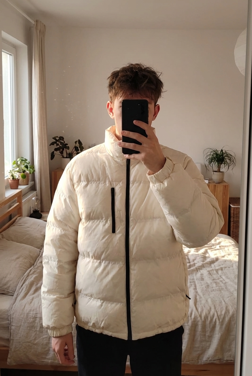 Tökéletes téli kabát standing straight facing the camera, in a softly lit bedroom setting, with gentle natural light filtering through a window.