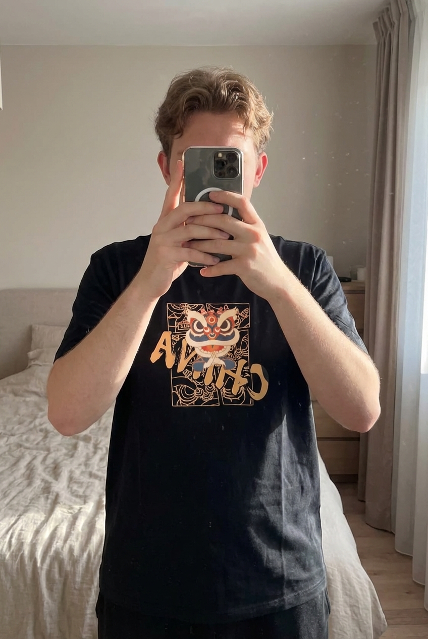 T shirt China debout, face à la caméra, dans une chambre à la lumière douce, avec une lumière naturelle filtrant par la fenêtre.