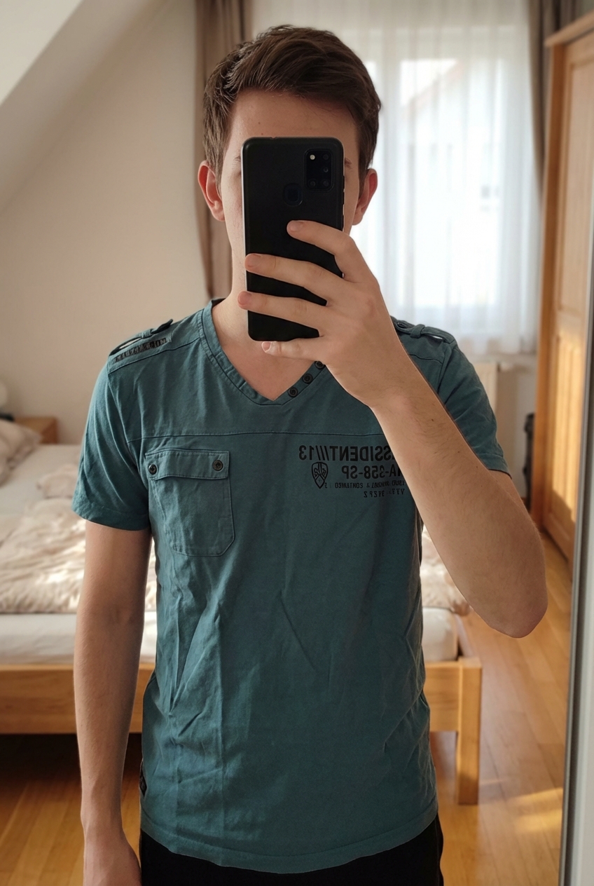T Shirt Dissident debout, face à la caméra, dans une chambre à la lumière douce, avec une lumière naturelle filtrant par la fenêtre.