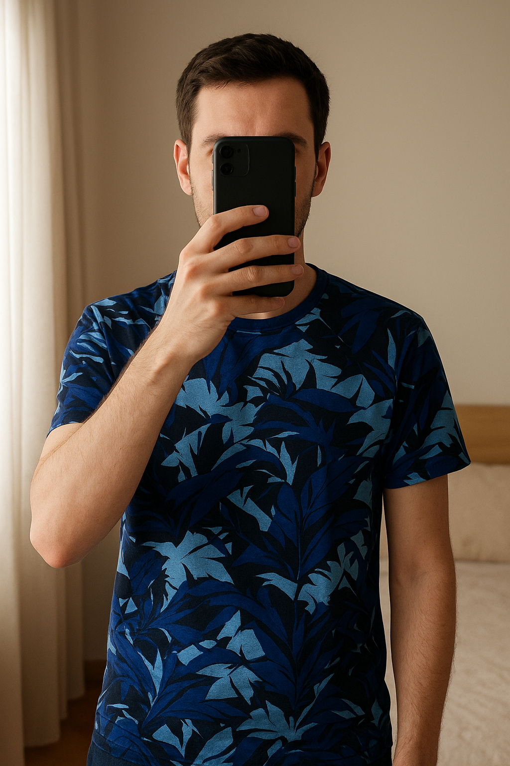 T-shirt homme H&M taille L debout, face à la caméra, dans une chambre à la lumière douce, avec une lumière naturelle filtrant par la fenêtre.