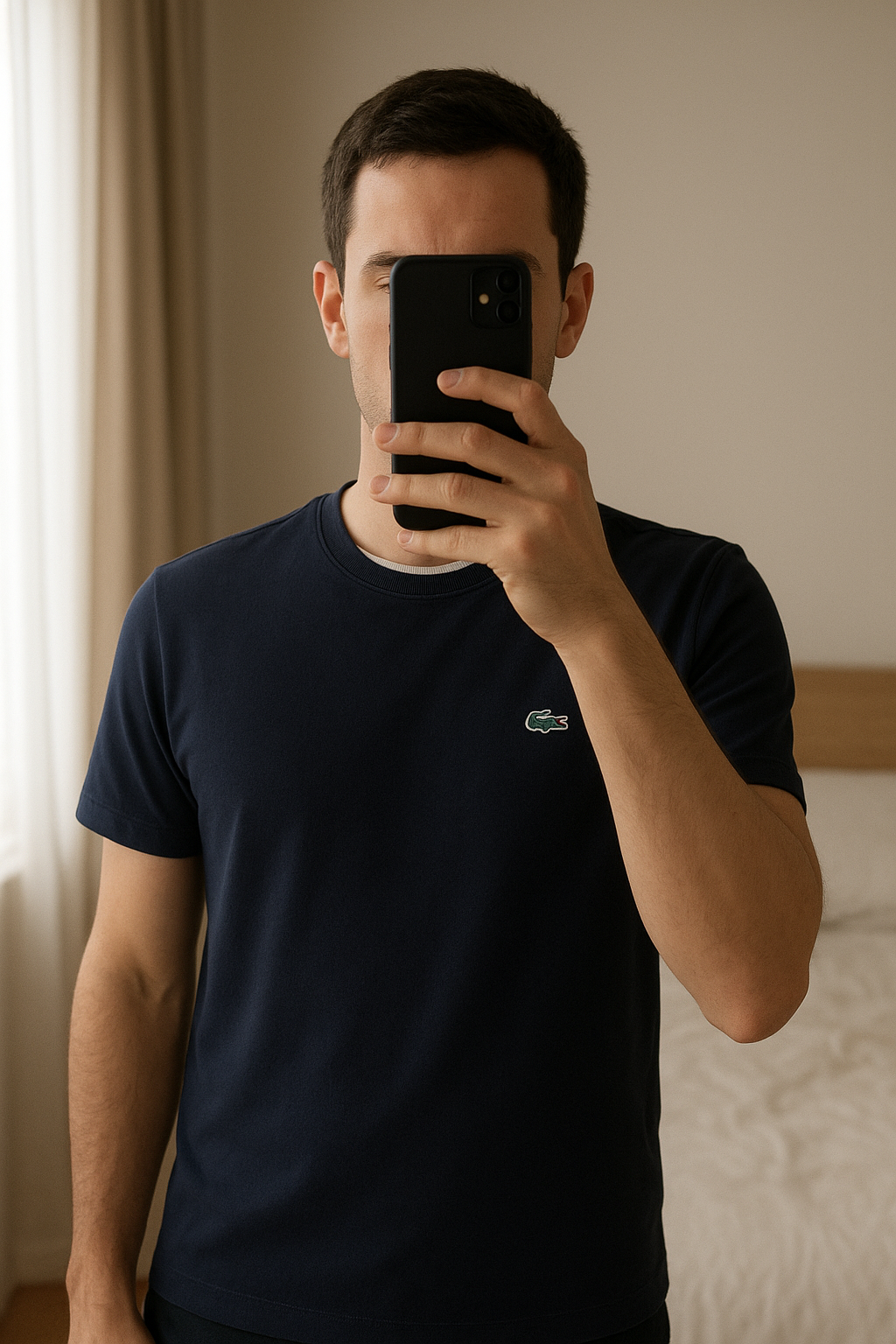 T shirt Lacoste taille S Tbe debout, face à la caméra, dans une chambre à la lumière douce, avec une lumière naturelle filtrant par la fenêtre.