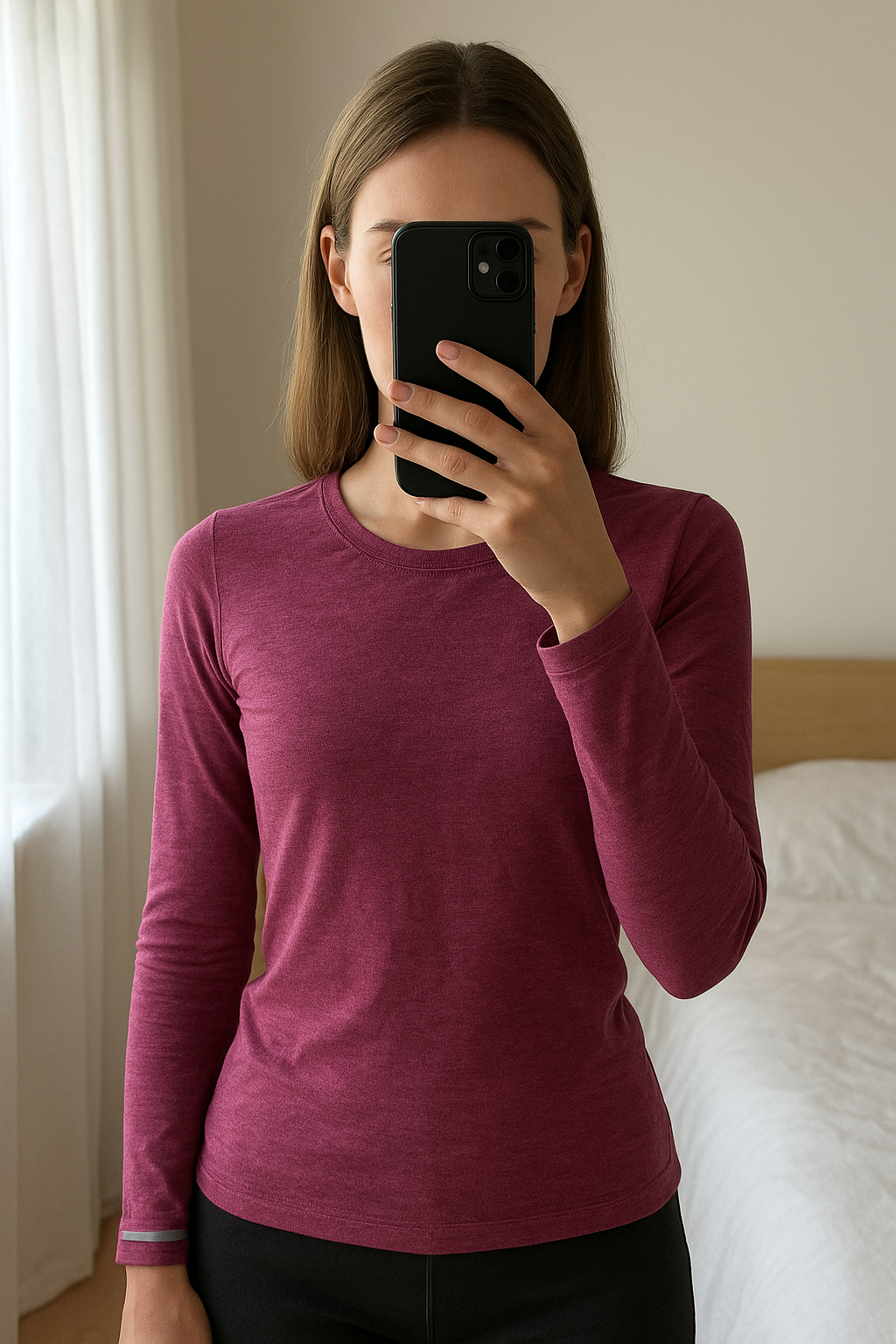 T-shirt manche longue debout, face à la caméra, dans une chambre à la lumière douce, avec une lumière naturelle filtrant par la fenêtre.