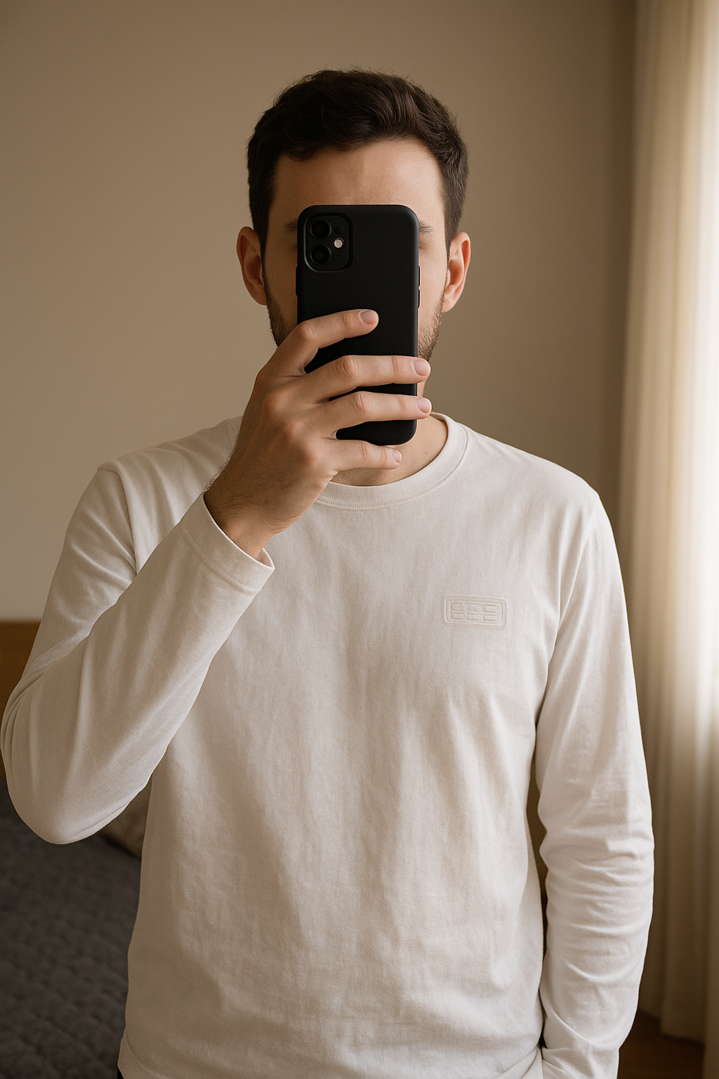 T-shirt manches longues Bizzbee - Taille L - Blanc debout, face à la caméra, dans une chambre à la lumière douce, avec une lumière naturelle filtrant par la fenêtre.