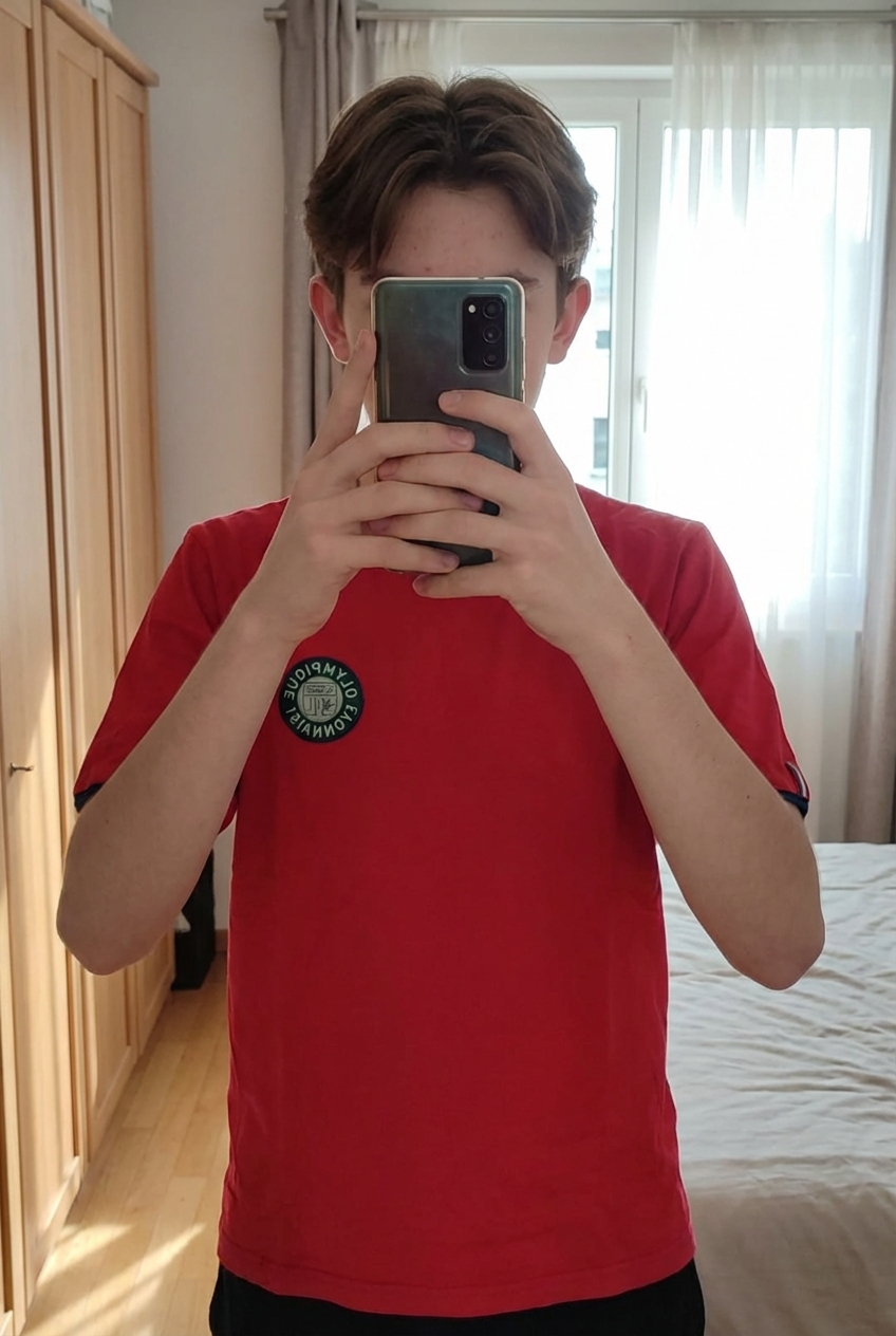 T shirt Olympique Lyonnais debout, face à la caméra, dans une chambre à la lumière douce, avec une lumière naturelle filtrant par la fenêtre.