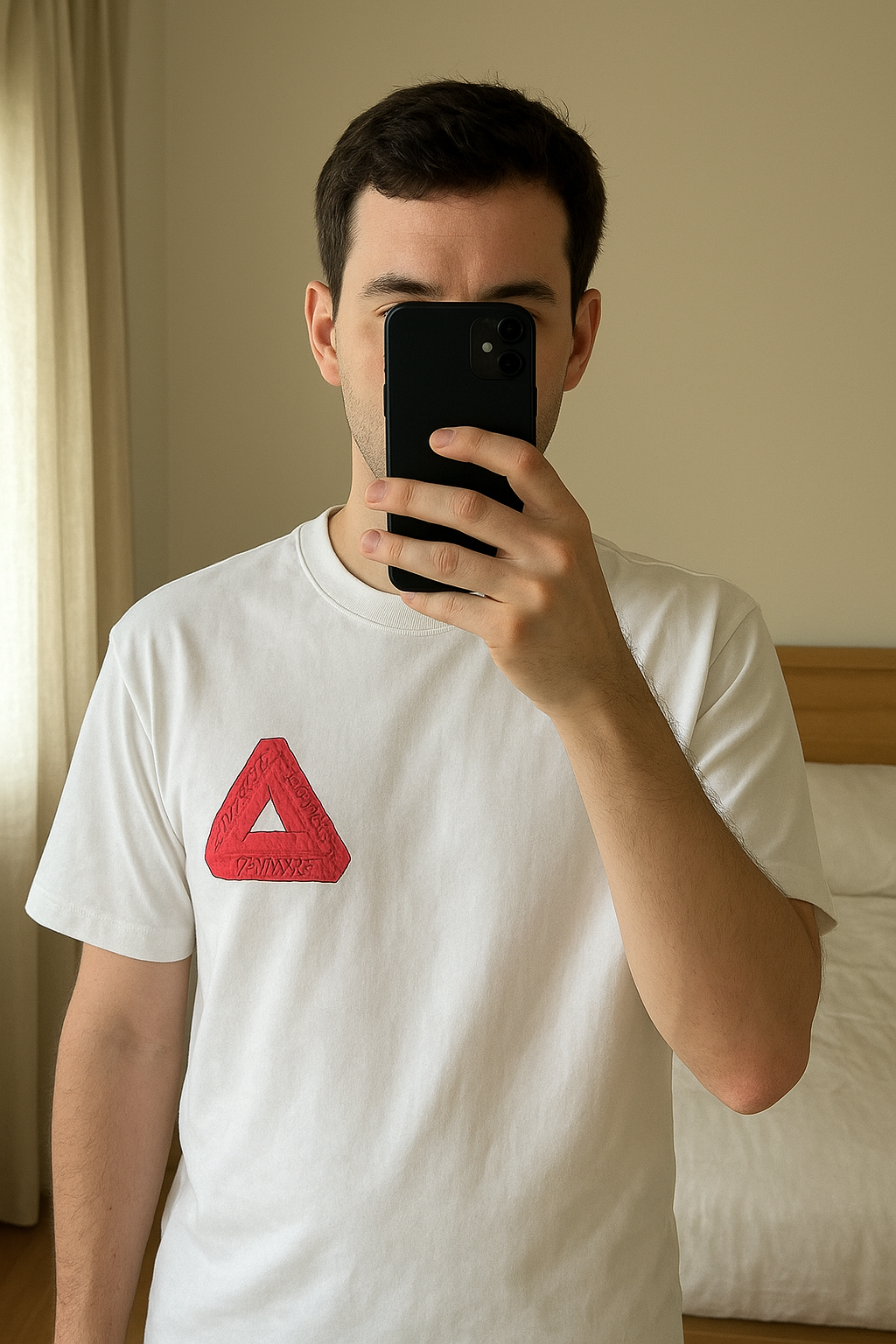 T-shirt PALACE logo debout, face à la caméra, dans une chambre à la lumière douce, avec une lumière naturelle filtrant par la fenêtre.