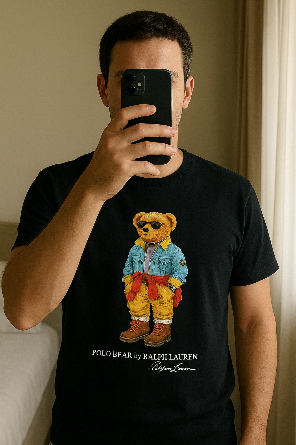 T shirt Polo Ralph Lauren Bear taille L noir debout, face à la caméra, dans une chambre à la lumière douce, avec une lumière naturelle filtrant par la fenêtre.