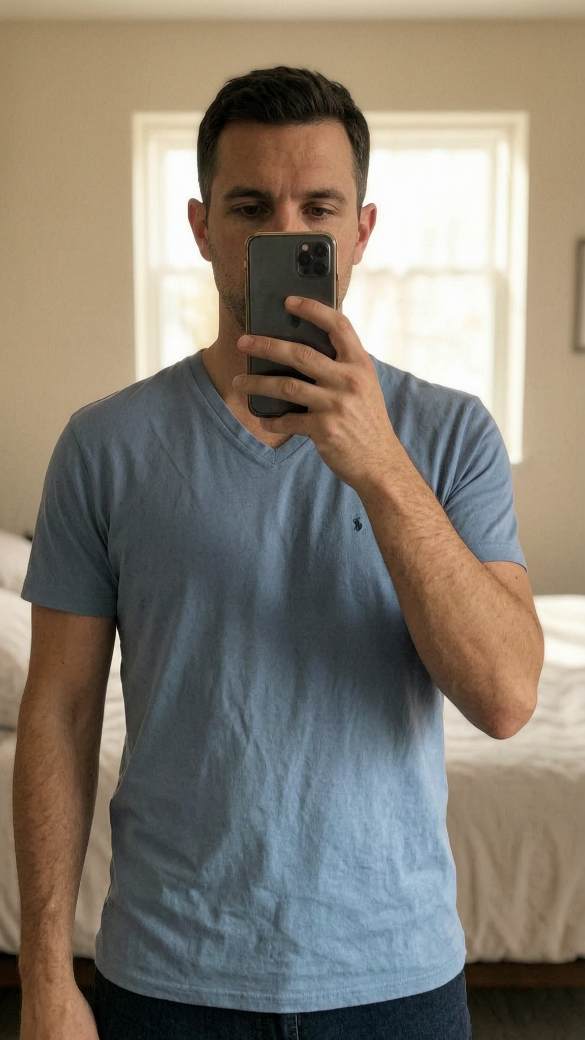 Une personne en T-shirt Polo Ralph Lauren bleu taille M debout, face à la caméra, dans une chambre à la lumière douce, avec une lumière naturelle filtrant par la fenêtre.