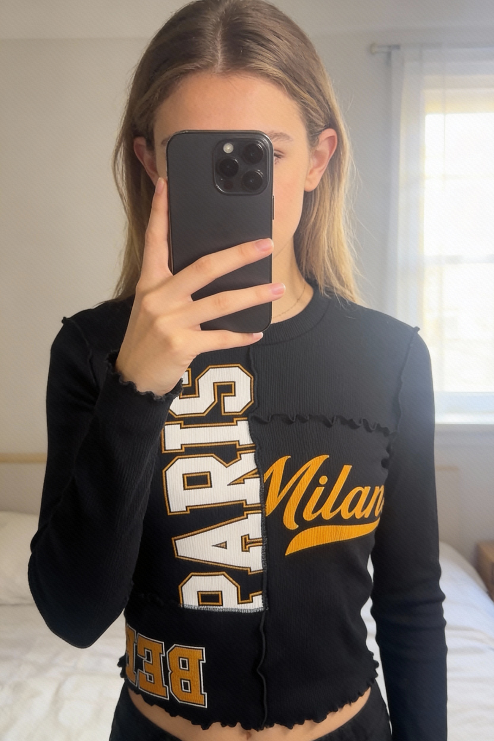 🖤 Tally Weijl Black “Paris Milan” Ribbed Long Sleeve Crop Top – XS standing straight facing the camera, in a softly lit bedroom setting, with gentle natural light filtering through a window.