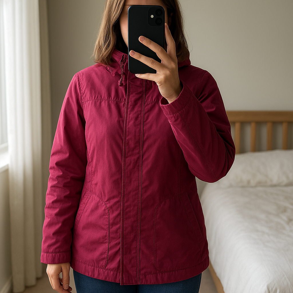 Tayberry Women's Cherry Red Fleece Lined Showerproof Coat / Anorak - Size 12 standing straight facing the camera, in a softly lit bedroom setting, with gentle natural light filtering through a window.
