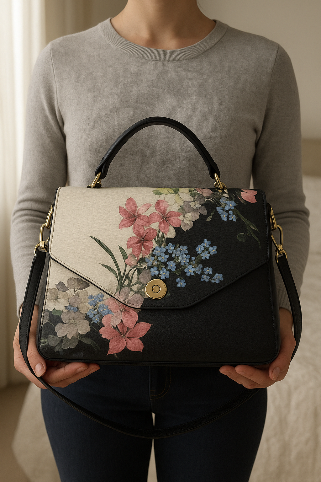 Ted Baker beautiful handbag only used a couple of times. 11 x 8 x 3" standing straight facing the camera, in a softly lit bedroom setting, with gentle natural light filtering through a window.