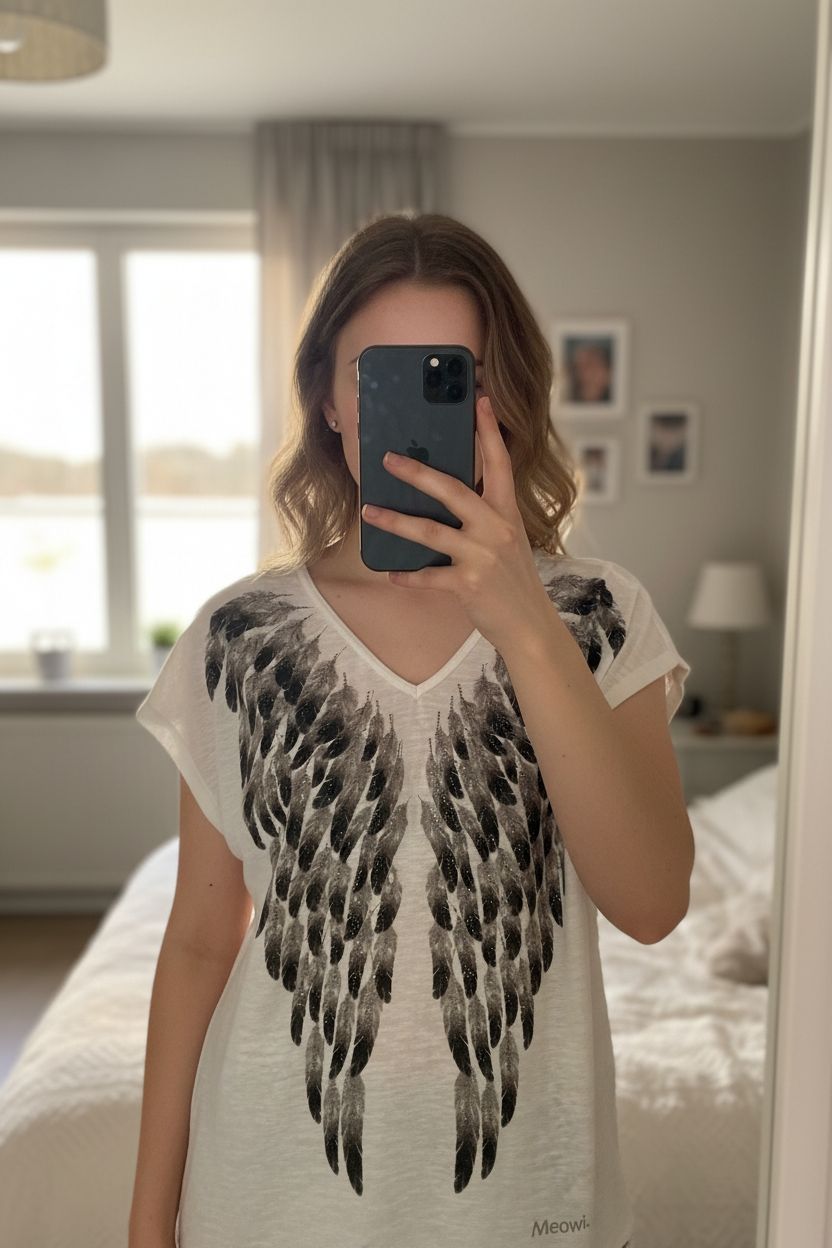 Tee shirt femme meowi taille unique debout, face à la caméra, dans une chambre à la lumière douce, avec une lumière naturelle filtrant par la fenêtre.
