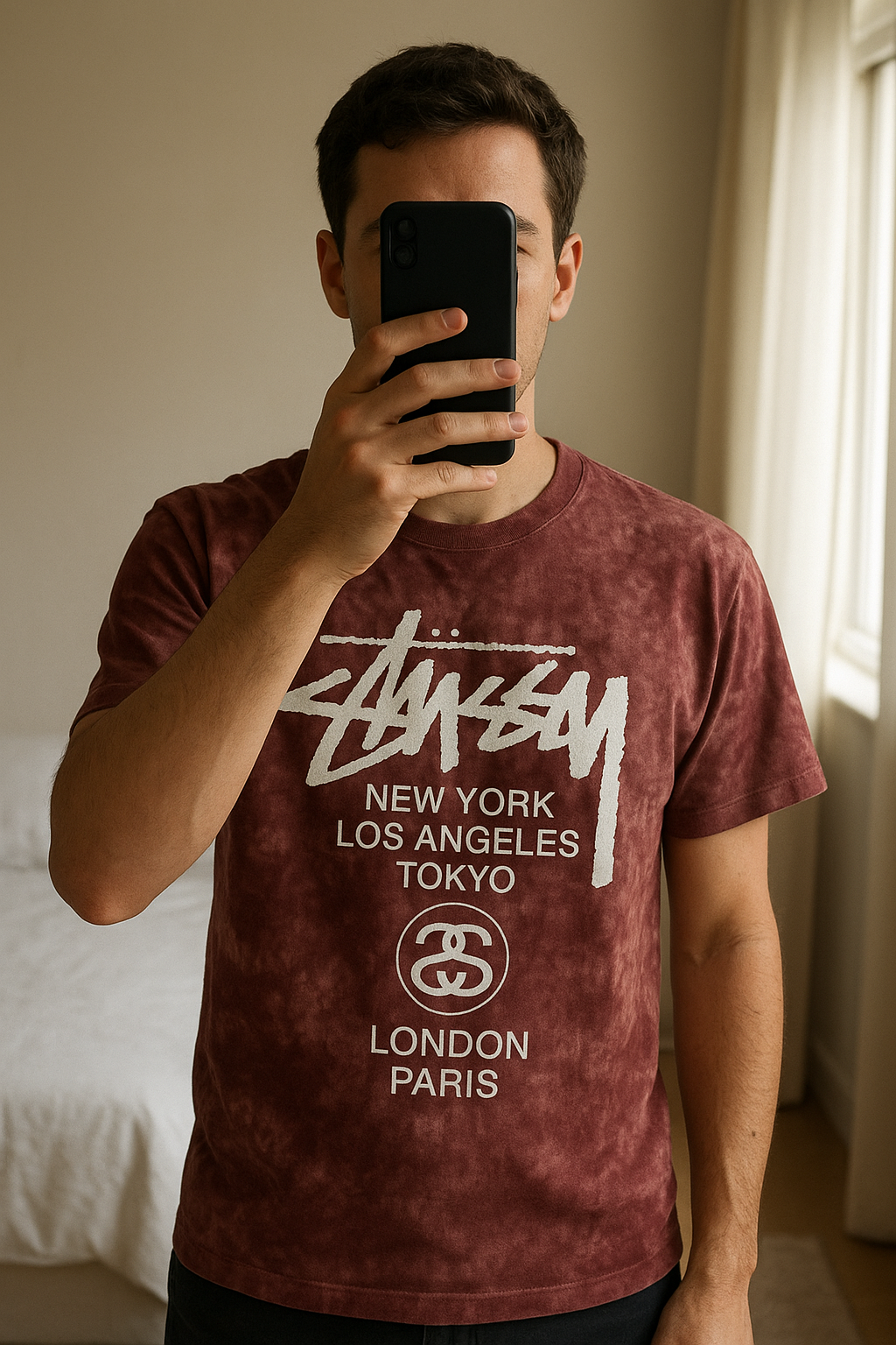 Tee shirt homme Stüssy M debout, face à la caméra, dans une chambre à la lumière douce, avec une lumière naturelle filtrant par la fenêtre.
