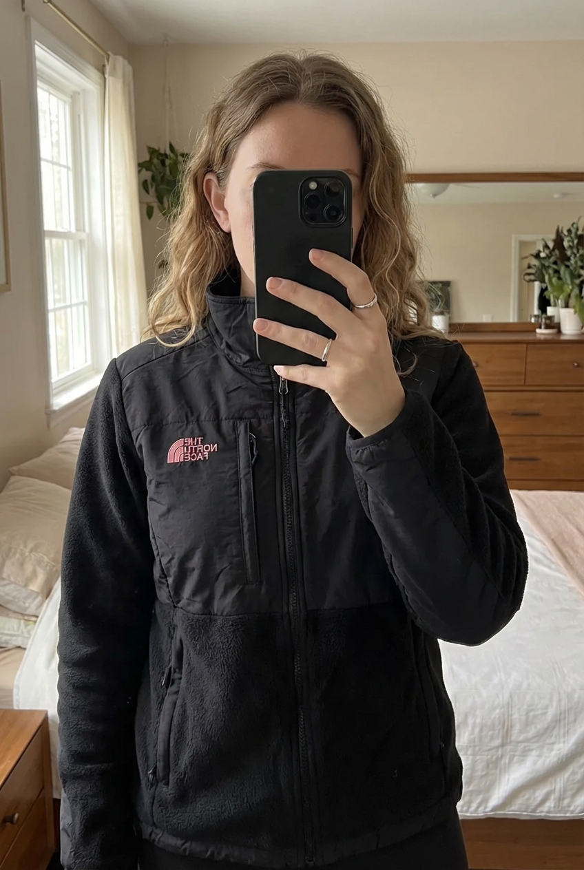 The North Face Retro Denali Fleece Jacket New Without Tag Black/Pink (Women’s) Size Medium standing straight facing the camera, in a softly lit bedroom setting, with gentle natural light filtering through a window.