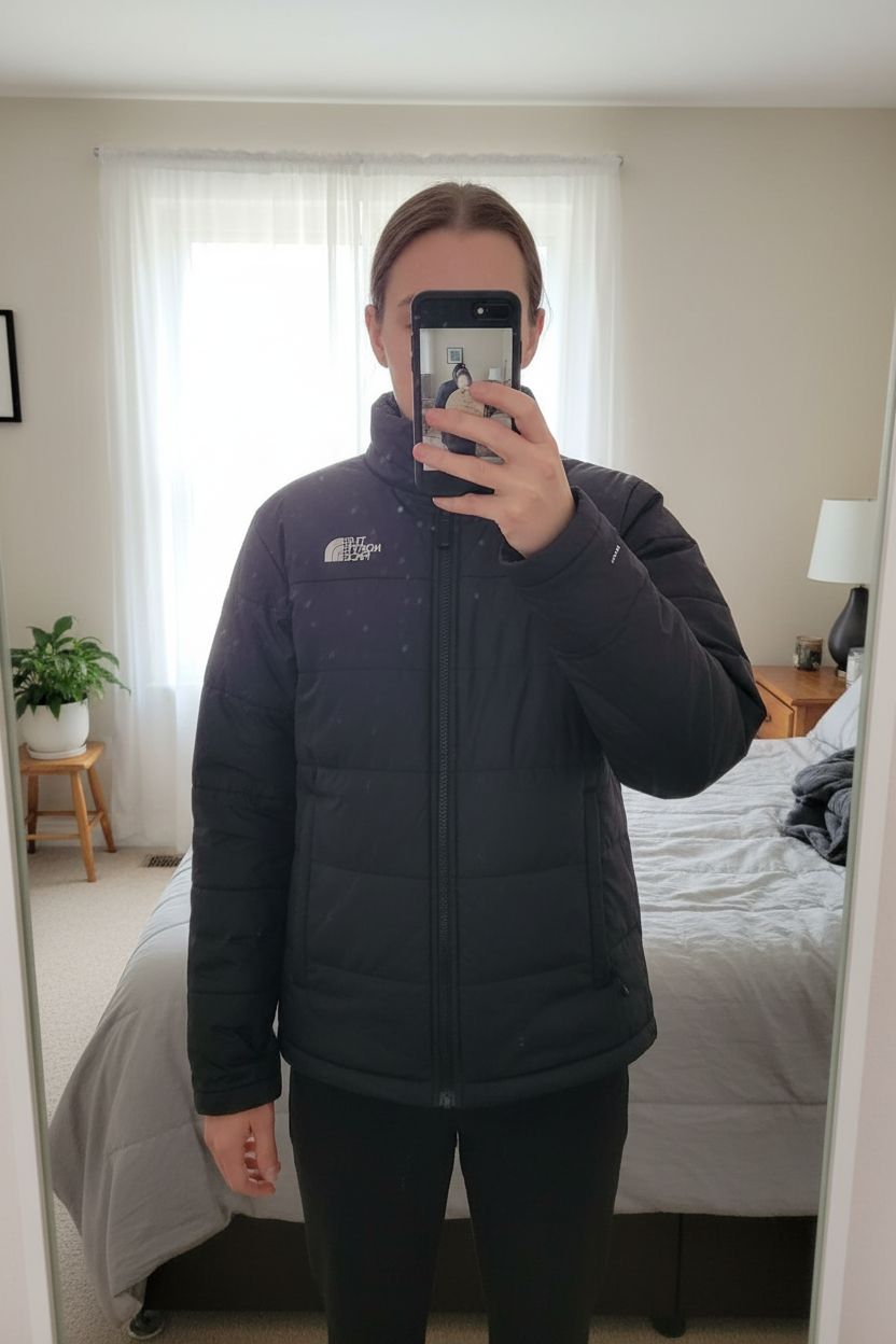 The North Face size M jacket black padded lightweight insulated puffer gorpcore standing straight facing the camera, in a softly lit bedroom setting, with gentle natural light filtering through a window.