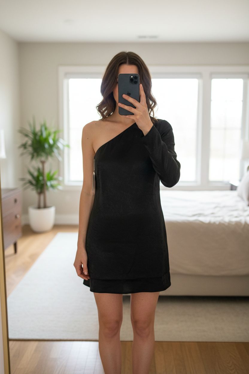 Third Form Running Water One Shoulder Mini Shift Dress UK 10 standing straight facing the camera, in a softly lit bedroom setting, with gentle natural light filtering through a window.