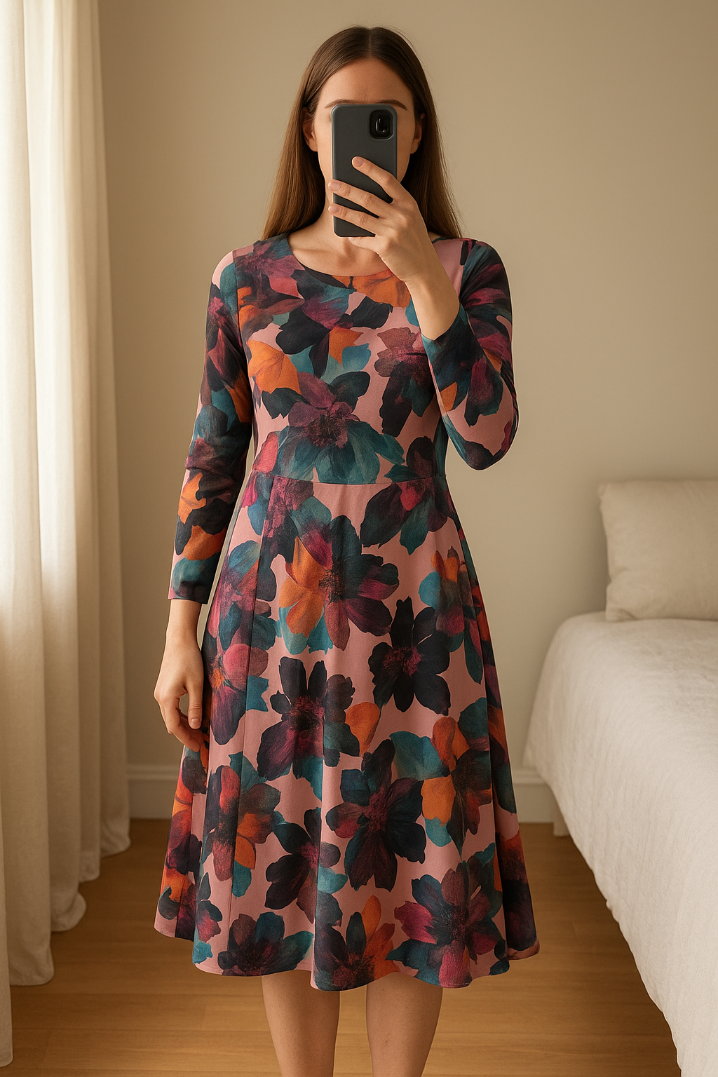 Tia / Godske floral fit & flare dress Christmas size 12 standing straight facing the camera, in a softly lit bedroom setting, with gentle natural light filtering through a window.