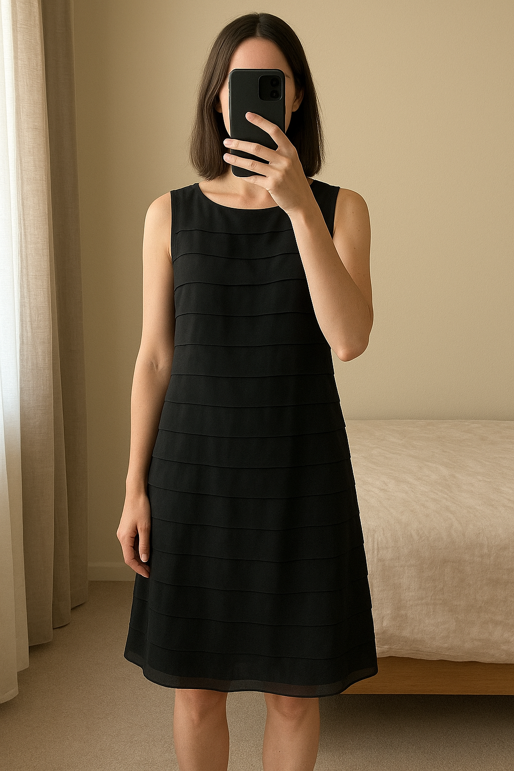 Tiered little black dress standing straight facing the camera, in a softly lit bedroom setting, with gentle natural light filtering through a window.