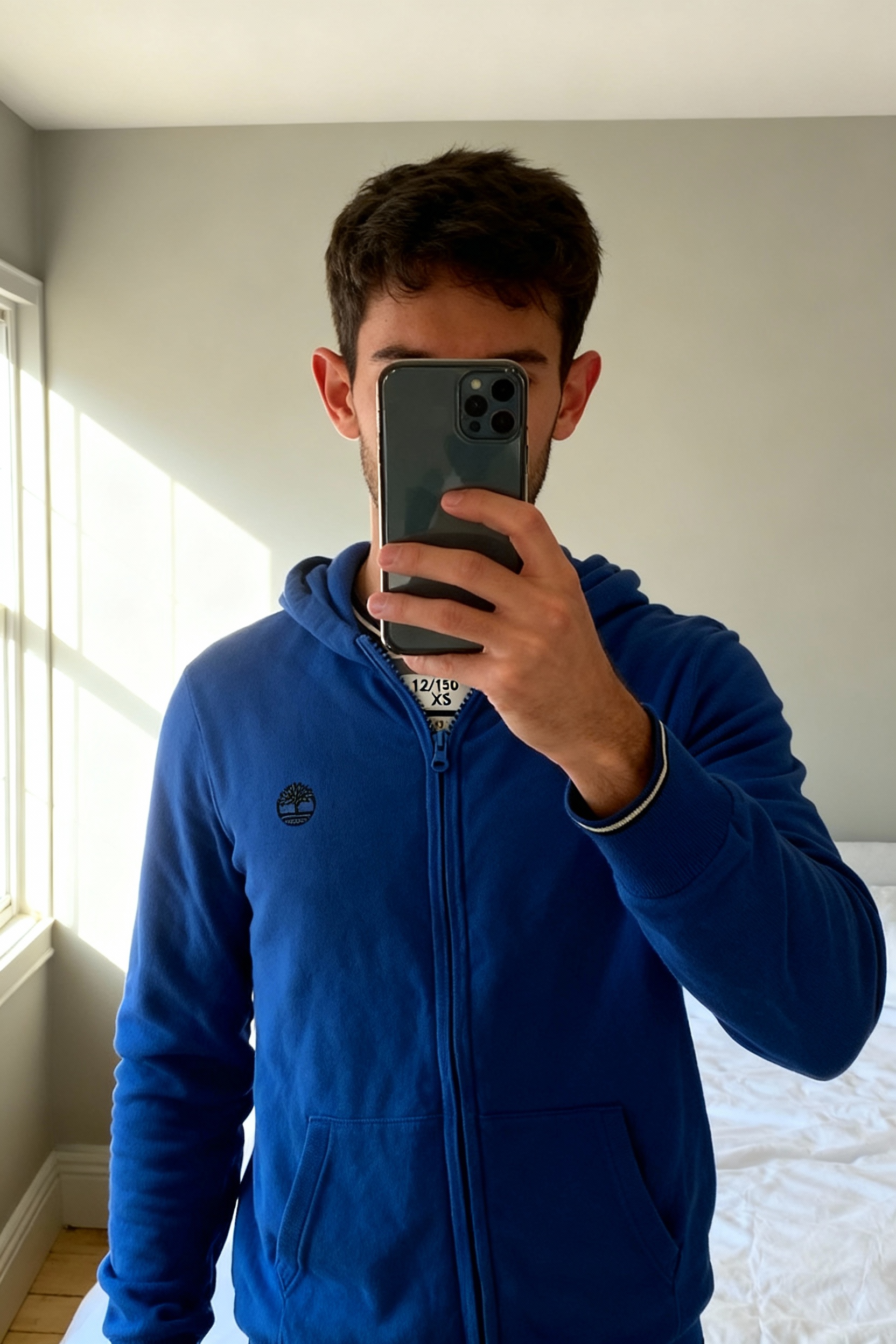Timberland hoodie standing straight facing the camera, in a softly lit bedroom setting, with gentle natural light filtering through a window.