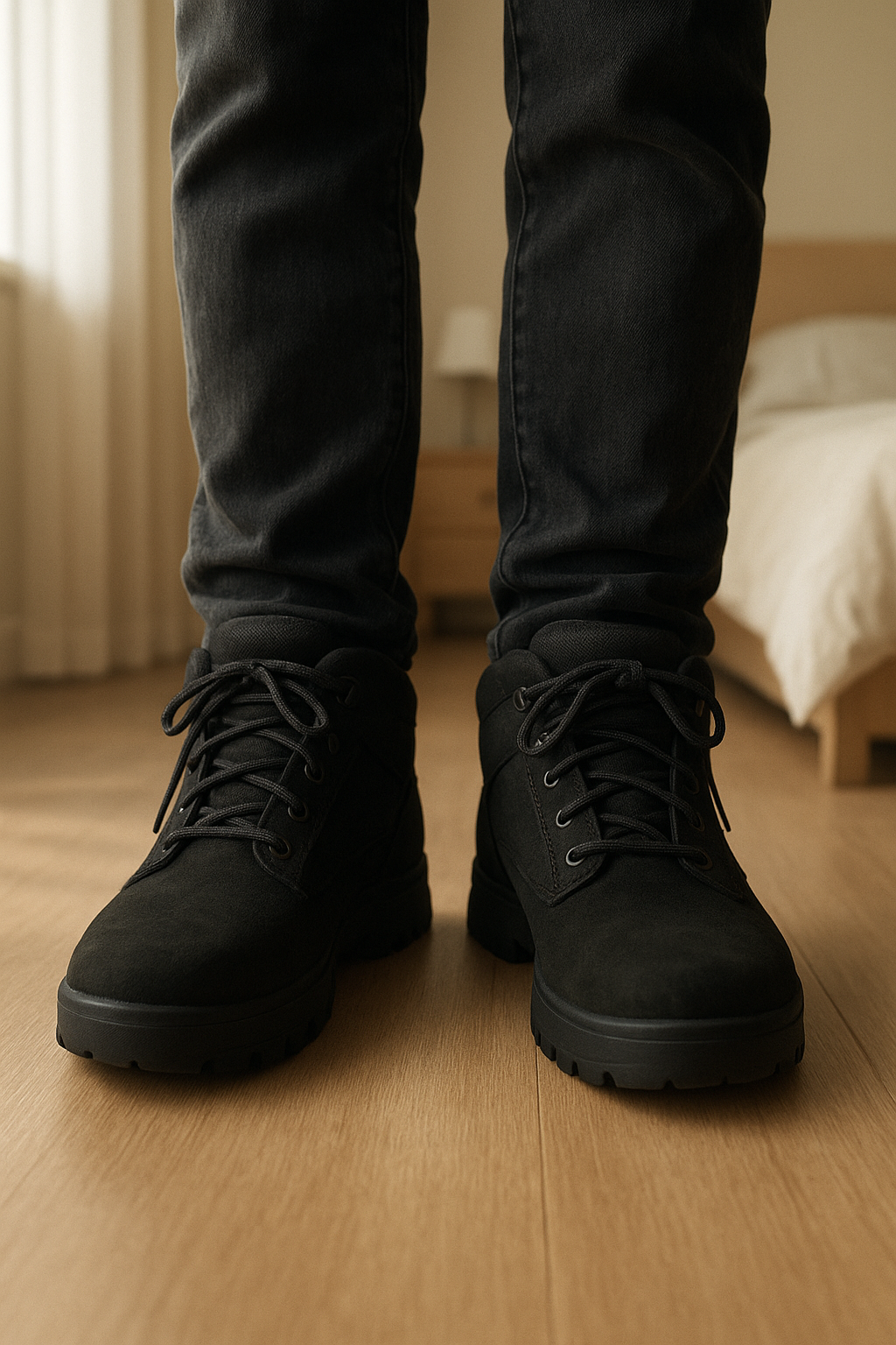 Timberland, ortholite, Sneackers noir, pointure 40, neuve, jamais porté, ortholite debout, face à la caméra, dans une chambre à la lumière douce, avec une lumière naturelle filtrant par la fenêtre.