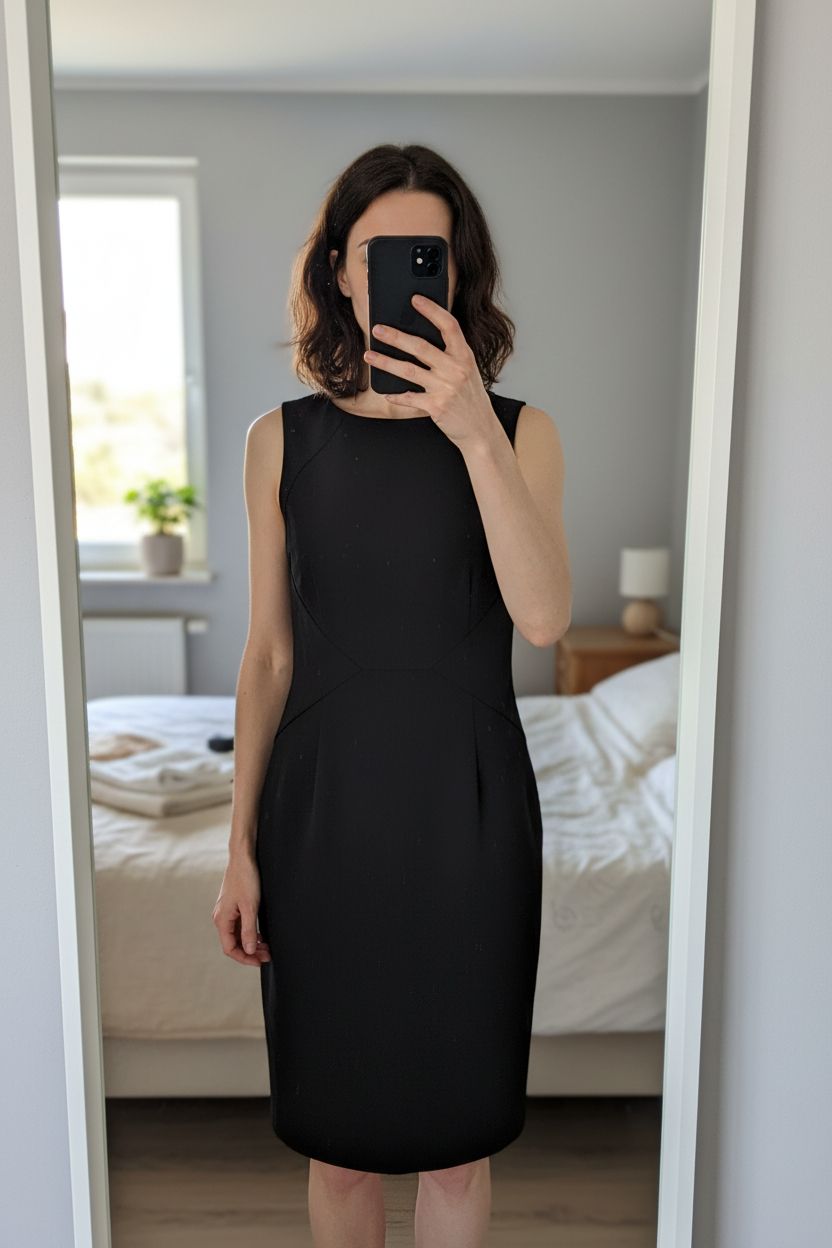 Eine Person in Tolles Businesskleid | Gr. 34 aufrecht stehend, der Kamera zugewandt, mit schlanker Figur, in einem sanft beleuchteten Schlafzimmer, mit natürlichem Licht, das durch ein Fenster fällt.