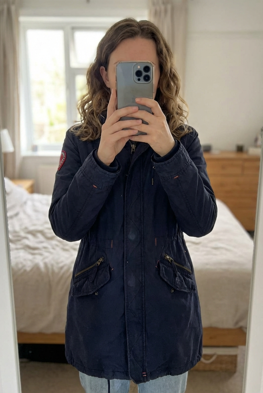 Tommy Hilfiger Navy Parka Coat with Statement Floral Lining 🌺 standing straight facing the camera, in a softly lit bedroom setting, with gentle natural light filtering through a window.