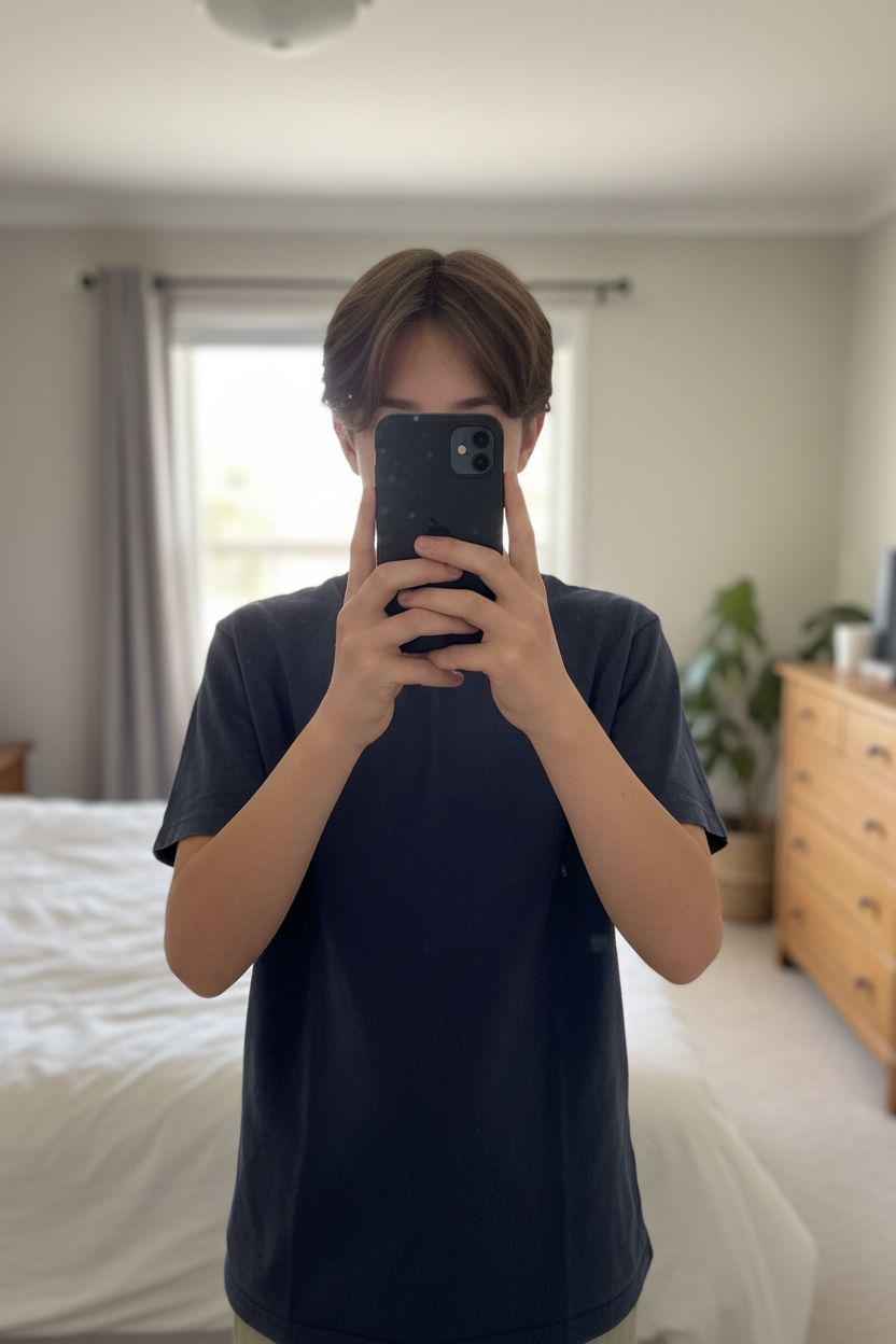 Tommy Hilfiger navy t shirt aged age 8 - 10 standing straight facing the camera, in a softly lit bedroom setting, with gentle natural light filtering through a window.