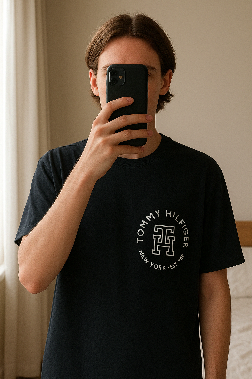 Tommy hilfiger tshirt standing straight facing the camera, in a softly lit bedroom setting, with gentle natural light filtering through a window.