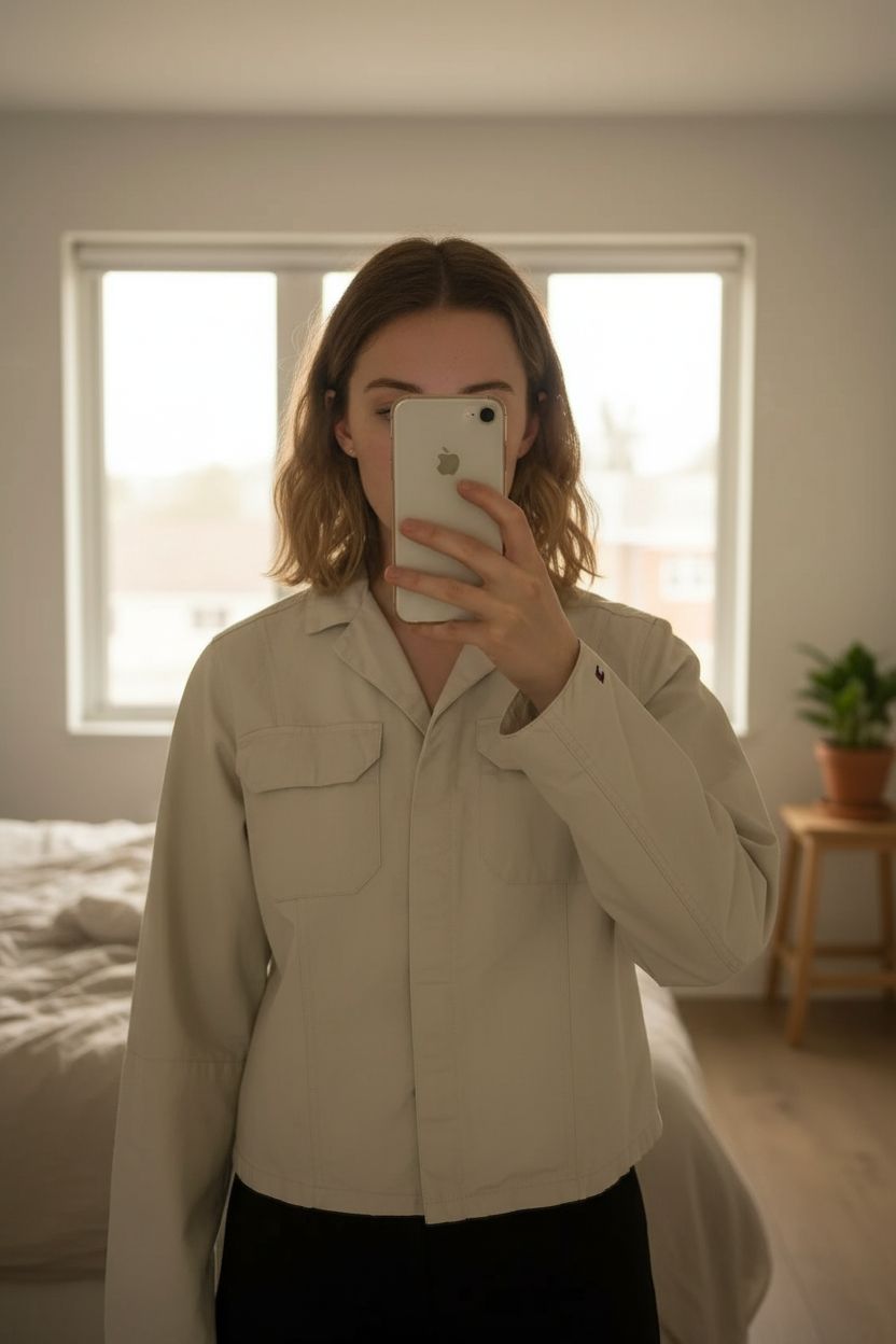 Tommy Hilfiger Vintage Beige Cropped Jacket 100% Cotton Spring Lightweight Size L standing straight facing the camera, in a softly lit bedroom setting, with gentle natural light filtering through a window.