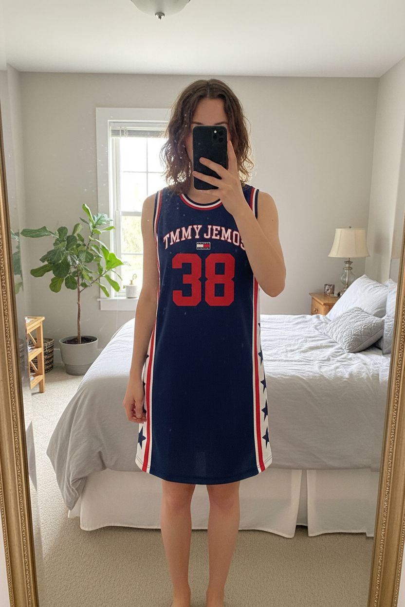 Tommy Jeans 85 Racer Dress Sporty Vintage Vibes (XS) standing straight facing the camera, in a softly lit bedroom setting, with gentle natural light filtering through a window.