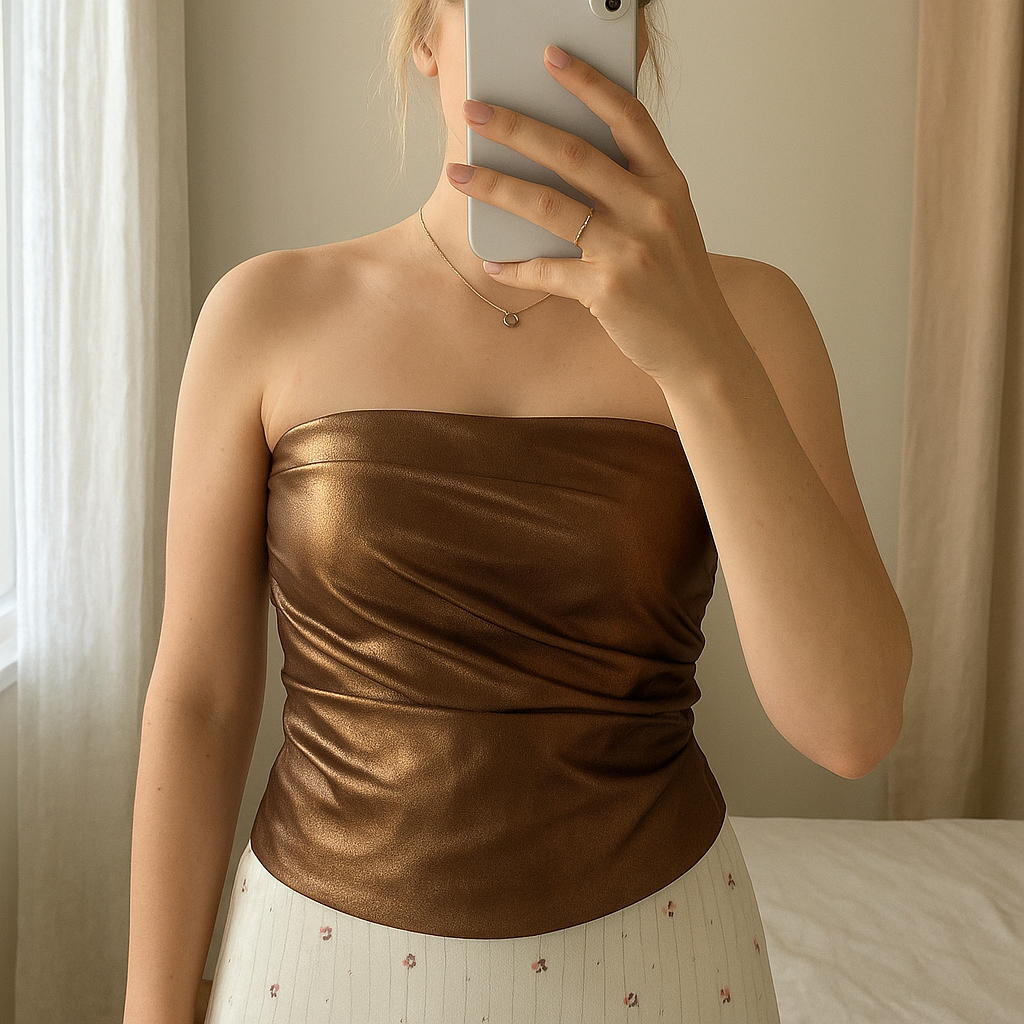 Top bustier bronze - Zara debout, face à la caméra, dans une chambre à la lumière douce, avec une lumière naturelle filtrant par la fenêtre.