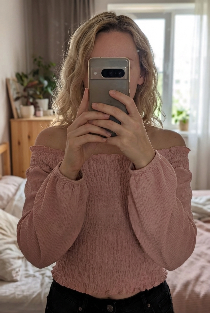 Top H&M rose clair Taille XS 💖 debout, face à la caméra, dans une chambre à la lumière douce, avec une lumière naturelle filtrant par la fenêtre.