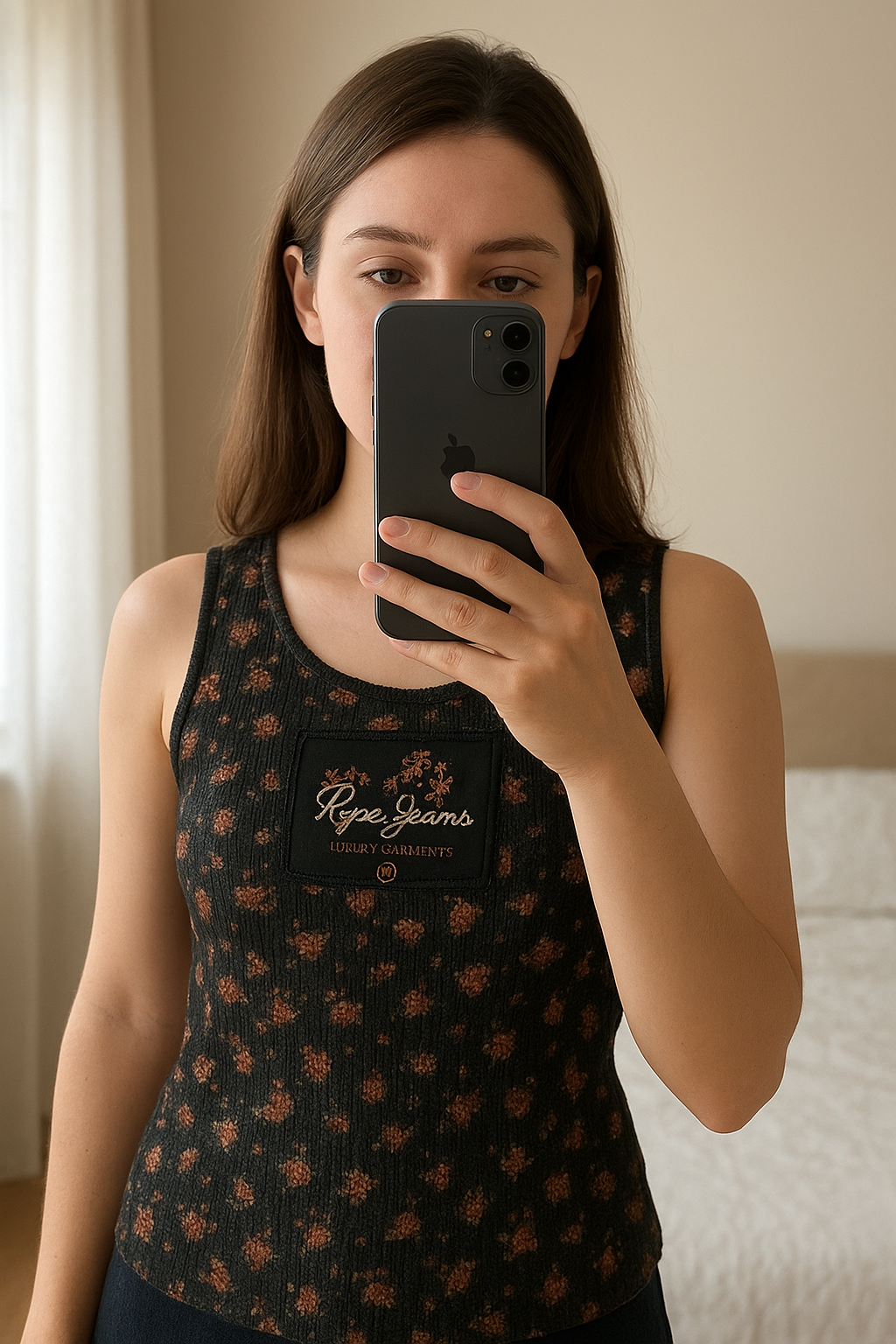 Top Pepe jeans T 40 /42 sequins debout, face à la caméra, dans une chambre à la lumière douce, avec une lumière naturelle filtrant par la fenêtre.