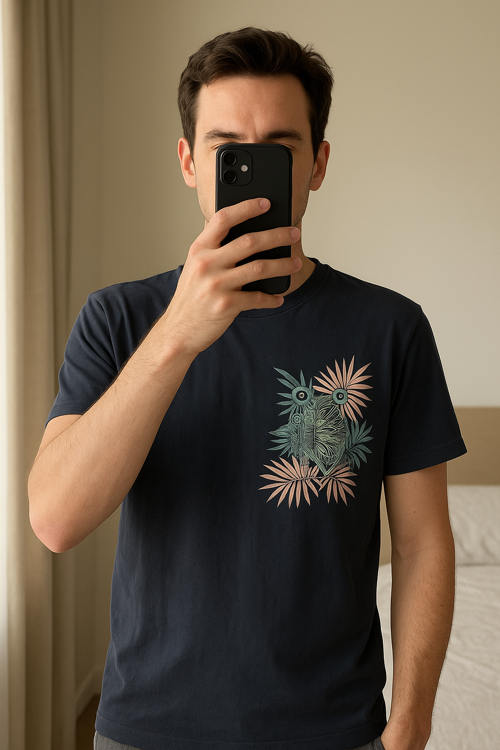Topical T-shirt standing straight facing the camera, in a softly lit bedroom setting, with gentle natural light filtering through a window.