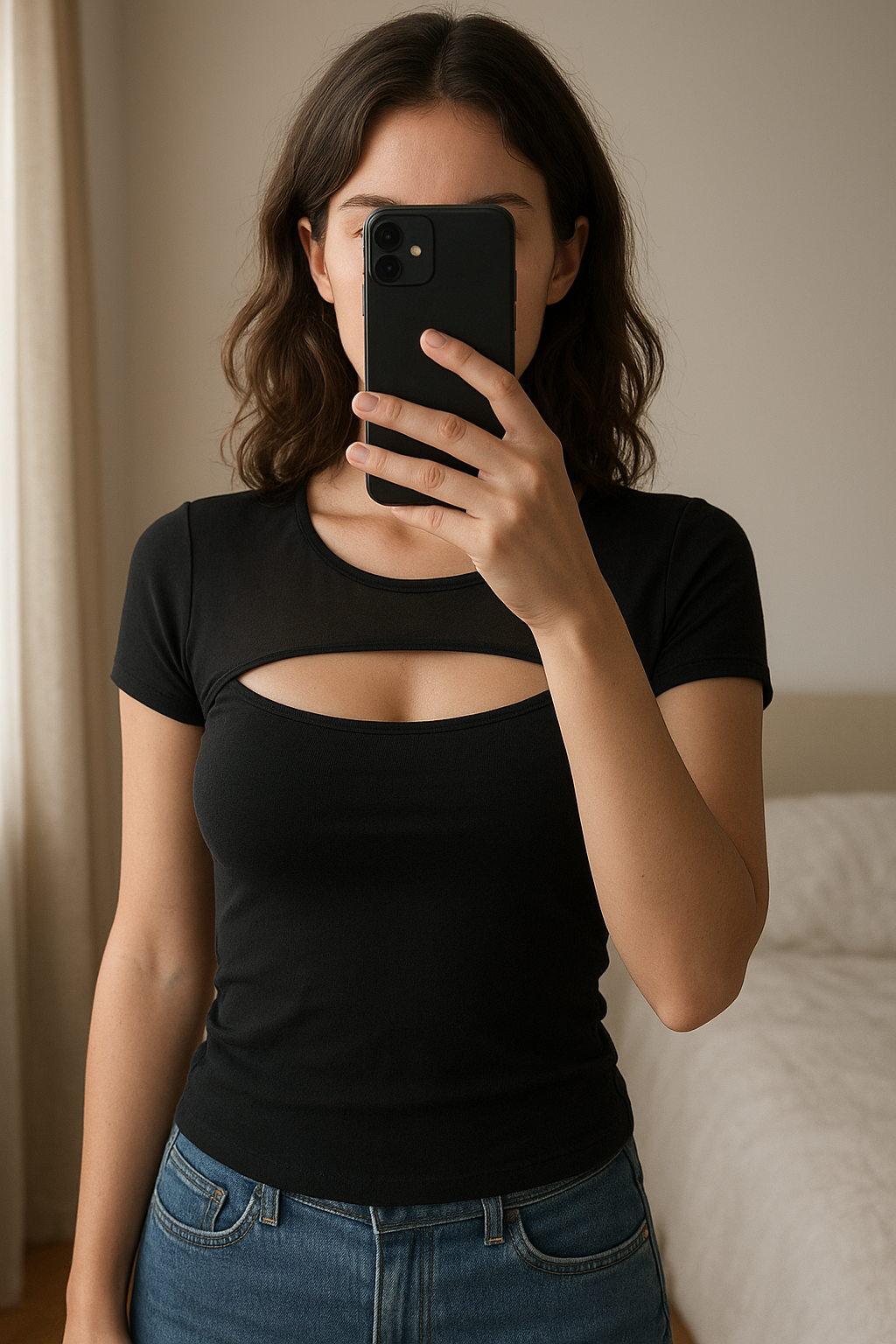 Tops noir debout, face à la caméra, dans une chambre à la lumière douce, avec une lumière naturelle filtrant par la fenêtre.