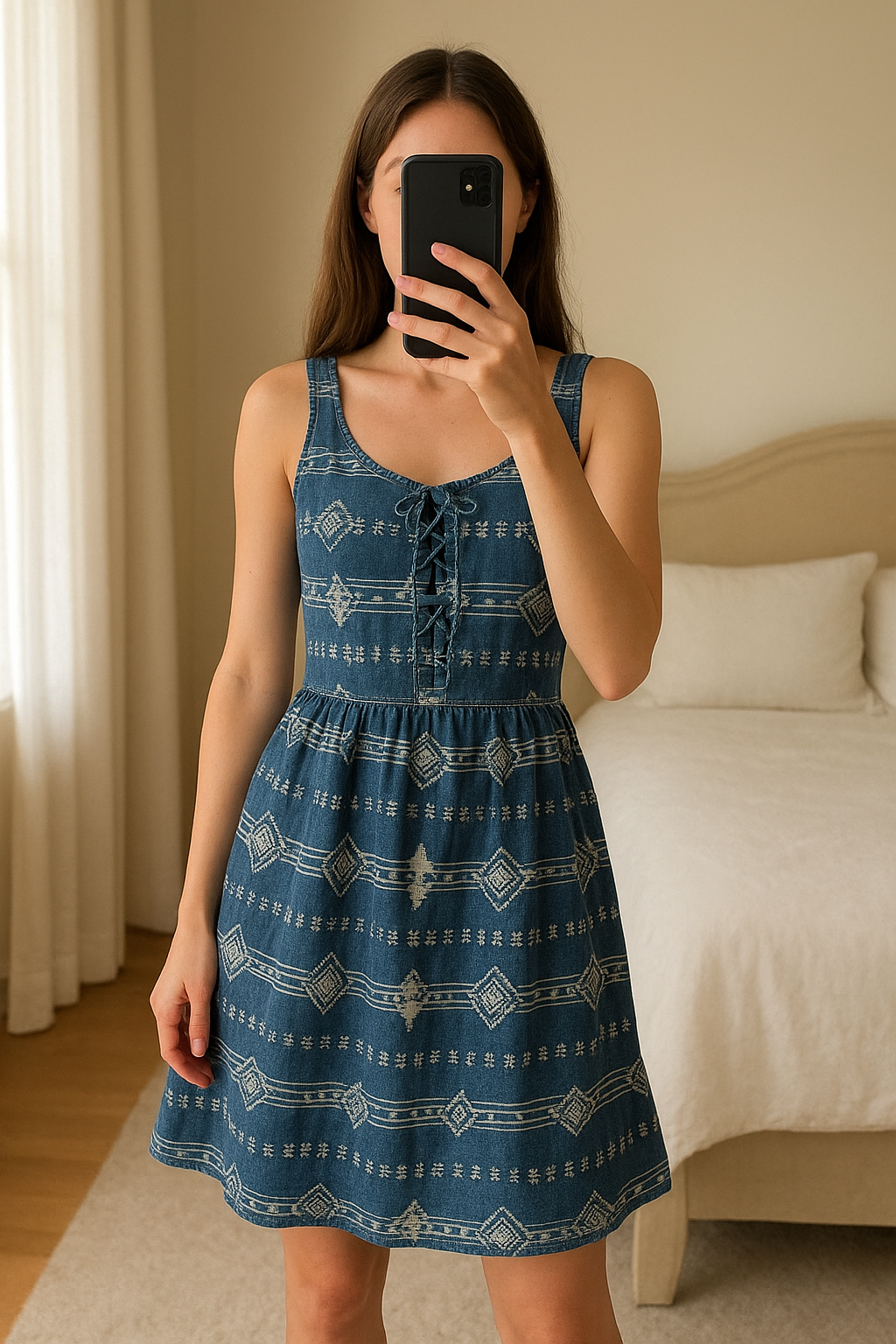 Topshop Dress standing straight facing the camera, in a softly lit bedroom setting, with gentle natural light filtering through a window.