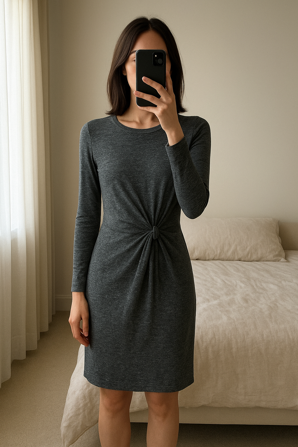 Topshop grey Marl long Sleeved dress - size 10 standing straight facing the camera, in a softly lit bedroom setting, with gentle natural light filtering through a window.