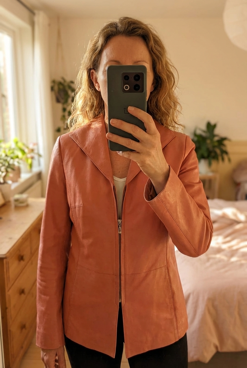 Torras leather jacket debout, face à la caméra, dans une chambre à la lumière douce, avec une lumière naturelle filtrant par la fenêtre.