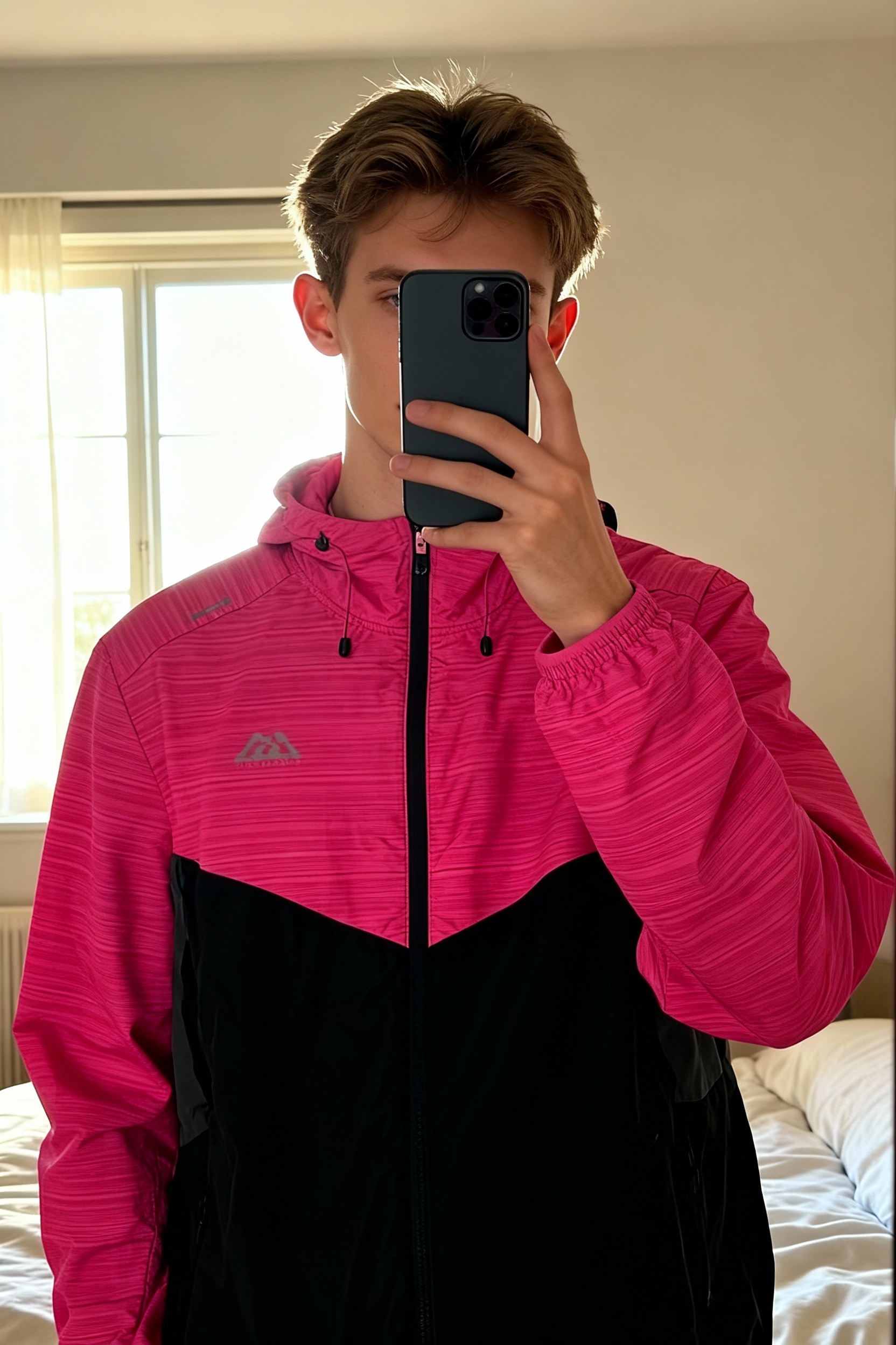 Trailberg Pink & Black Windbreaker standing straight facing the camera, in a softly lit bedroom setting, with gentle natural light filtering through a window.