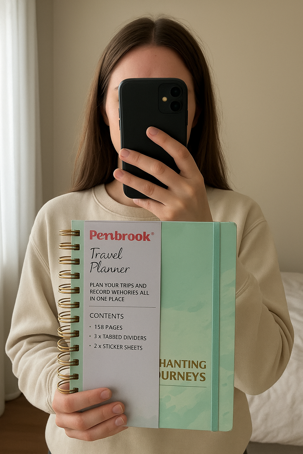 Travel planner ~ Charting journeys standing straight facing the camera, in a softly lit bedroom setting, with gentle natural light filtering through a window.