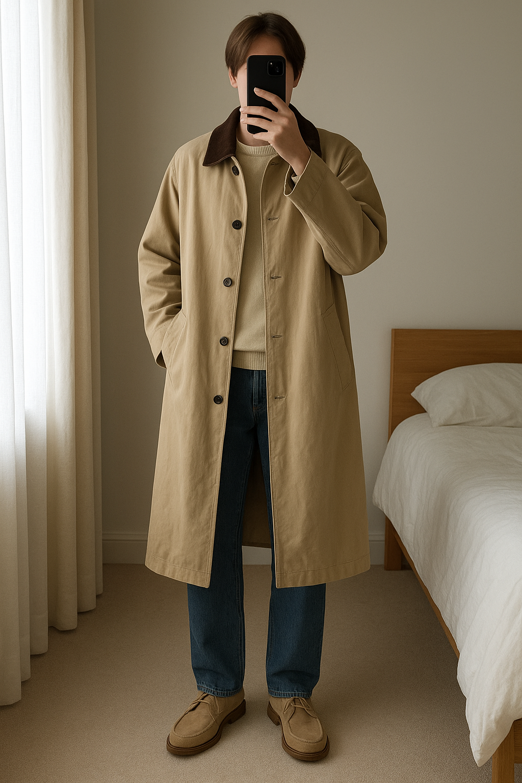 Trench debout, face à la caméra, dans une chambre à la lumière douce, avec une lumière naturelle filtrant par la fenêtre.