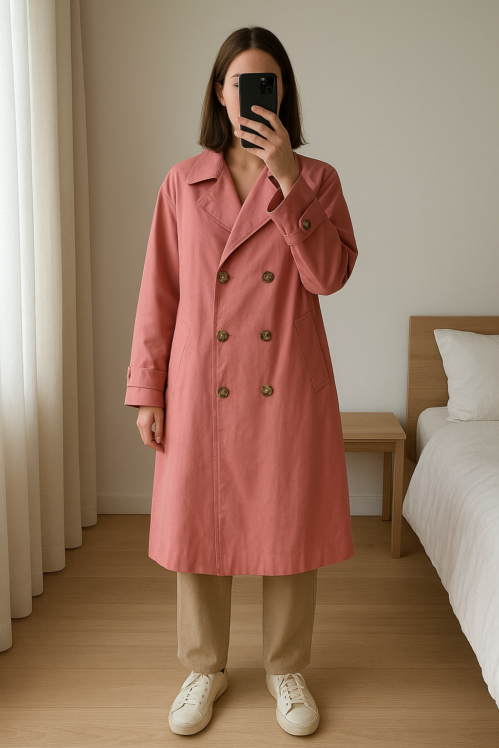Trench Primark 42 debout, face à la caméra, dans une chambre à la lumière douce, avec une lumière naturelle filtrant par la fenêtre.