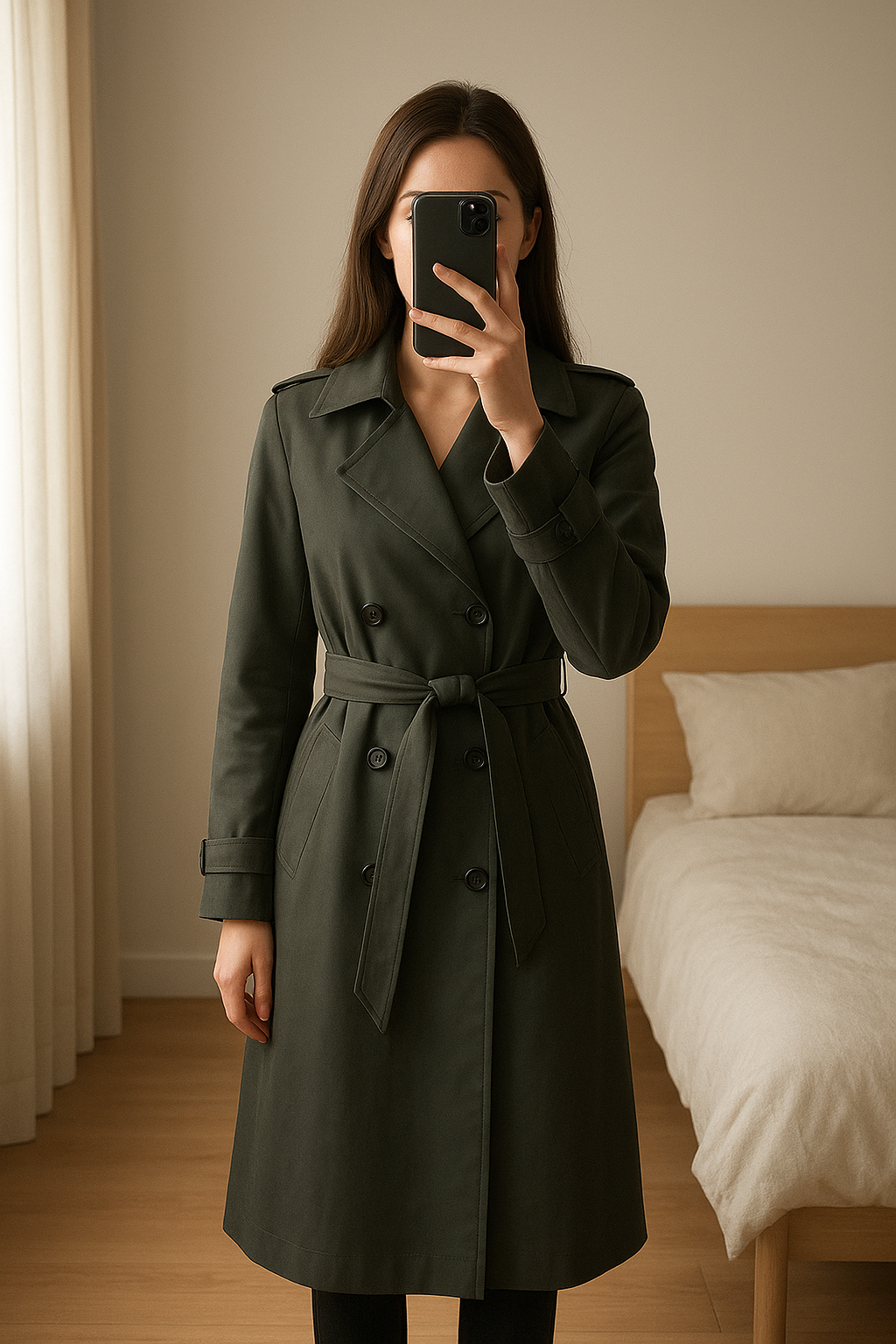 Trench pull and bear debout, face à la caméra, dans une chambre à la lumière douce, avec une lumière naturelle filtrant par la fenêtre.