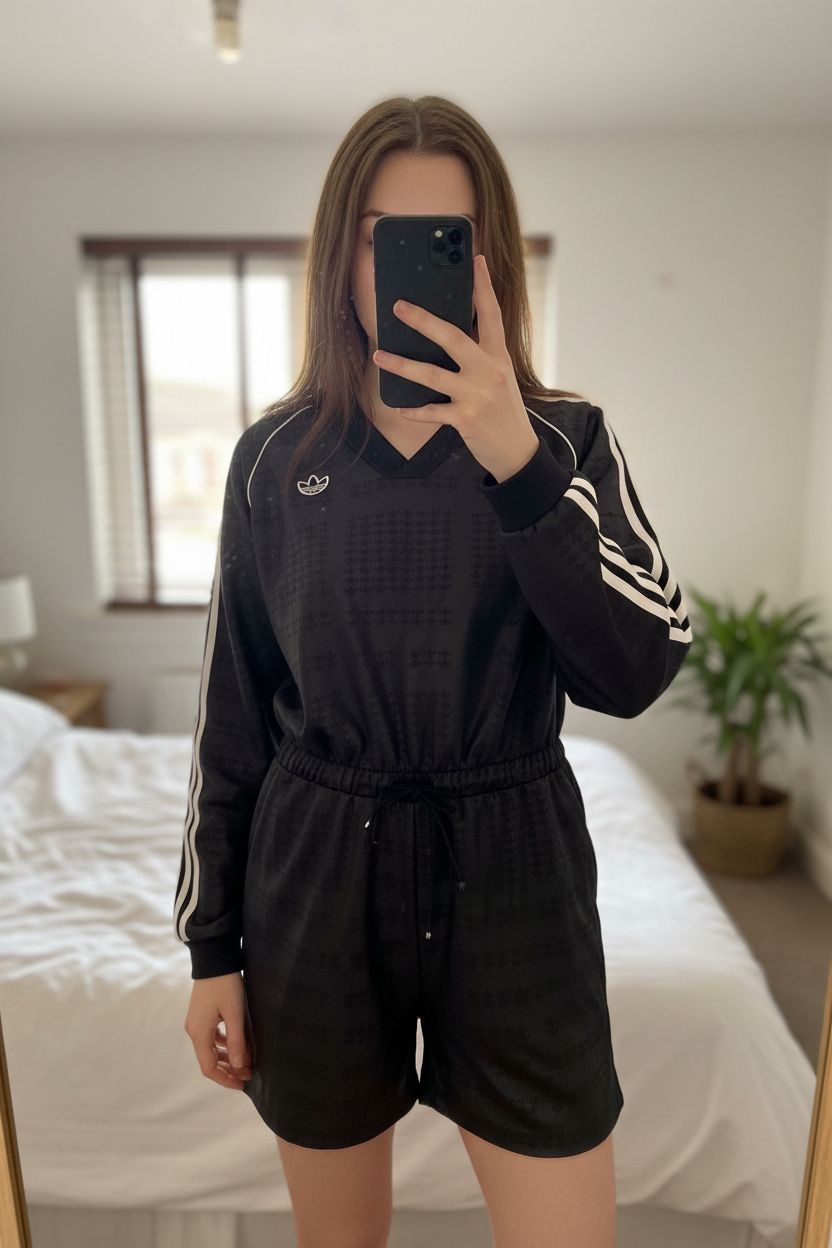 Trendy Adidas Size 6 Playsuit – Sporty Chic Vibes! standing straight facing the camera, in a softly lit bedroom setting, with gentle natural light filtering through a window.