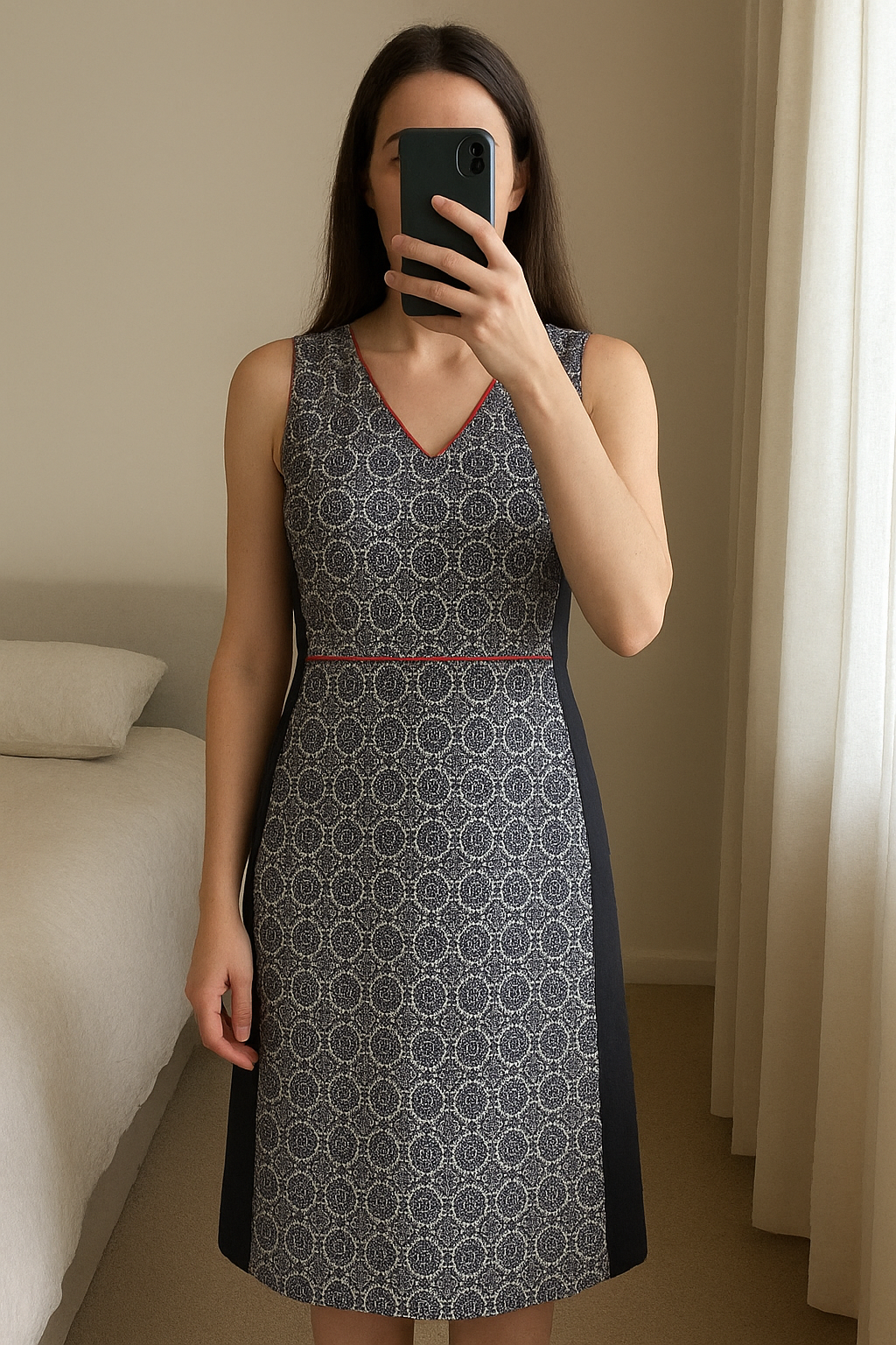 TU body con side panel dress size 10 standing straight facing the camera, in a softly lit bedroom setting, with gentle natural light filtering through a window.