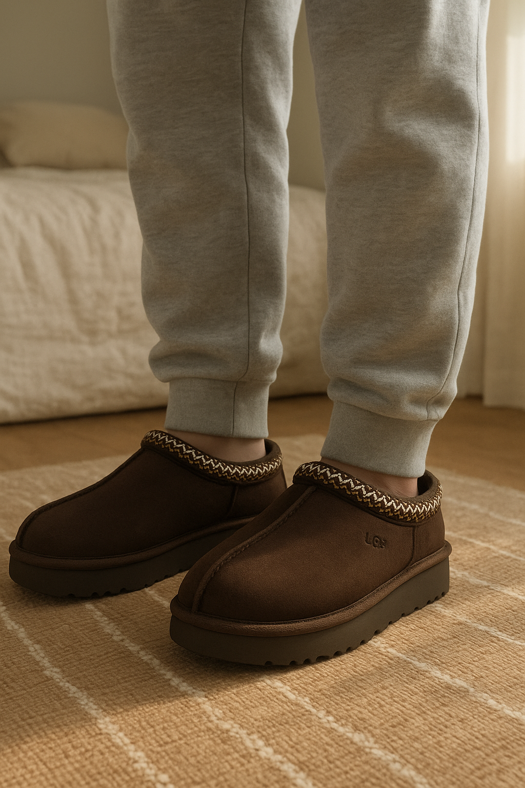 Ugg marron semelle haute debout, face à la caméra, dans une chambre à la lumière douce, avec une lumière naturelle filtrant par la fenêtre.