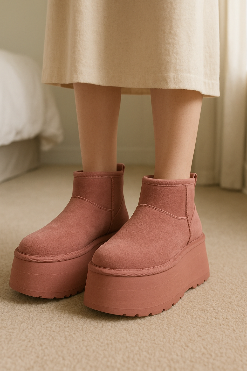 Ugg Mini Dipper Legwarmer standing straight facing the camera, in a softly lit bedroom setting, with gentle natural light filtering through a window.