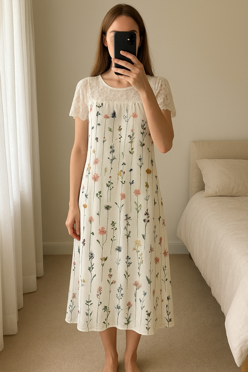 Unbranded silky floral dress standing straight facing the camera, in a softly lit bedroom setting, with gentle natural light filtering through a window.