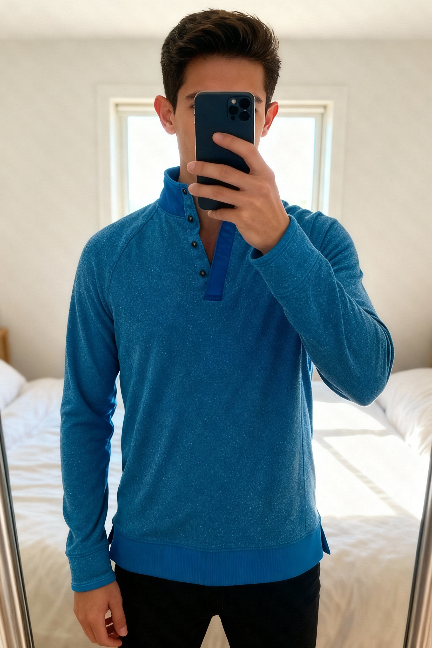 Under Armer jumper standing straight facing the camera, in a softly lit bedroom setting, with gentle natural light filtering through a window.