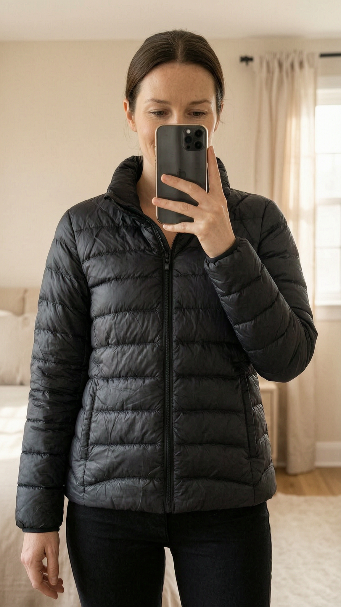 Uniquo softshell jacket, black, large standing straight facing the camera, in a softly lit bedroom setting, with gentle natural light filtering through a window.